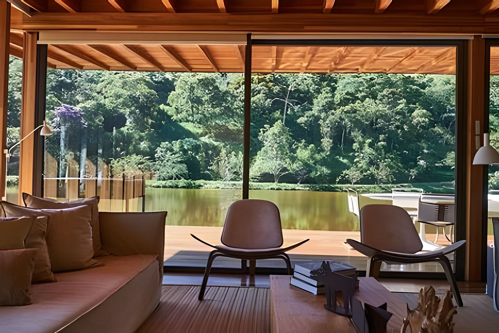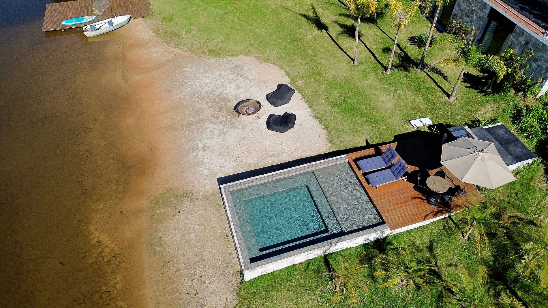 • Espreguiçadeiras e sofás à beira do lago, com tacho de cobre para aquecer as noites