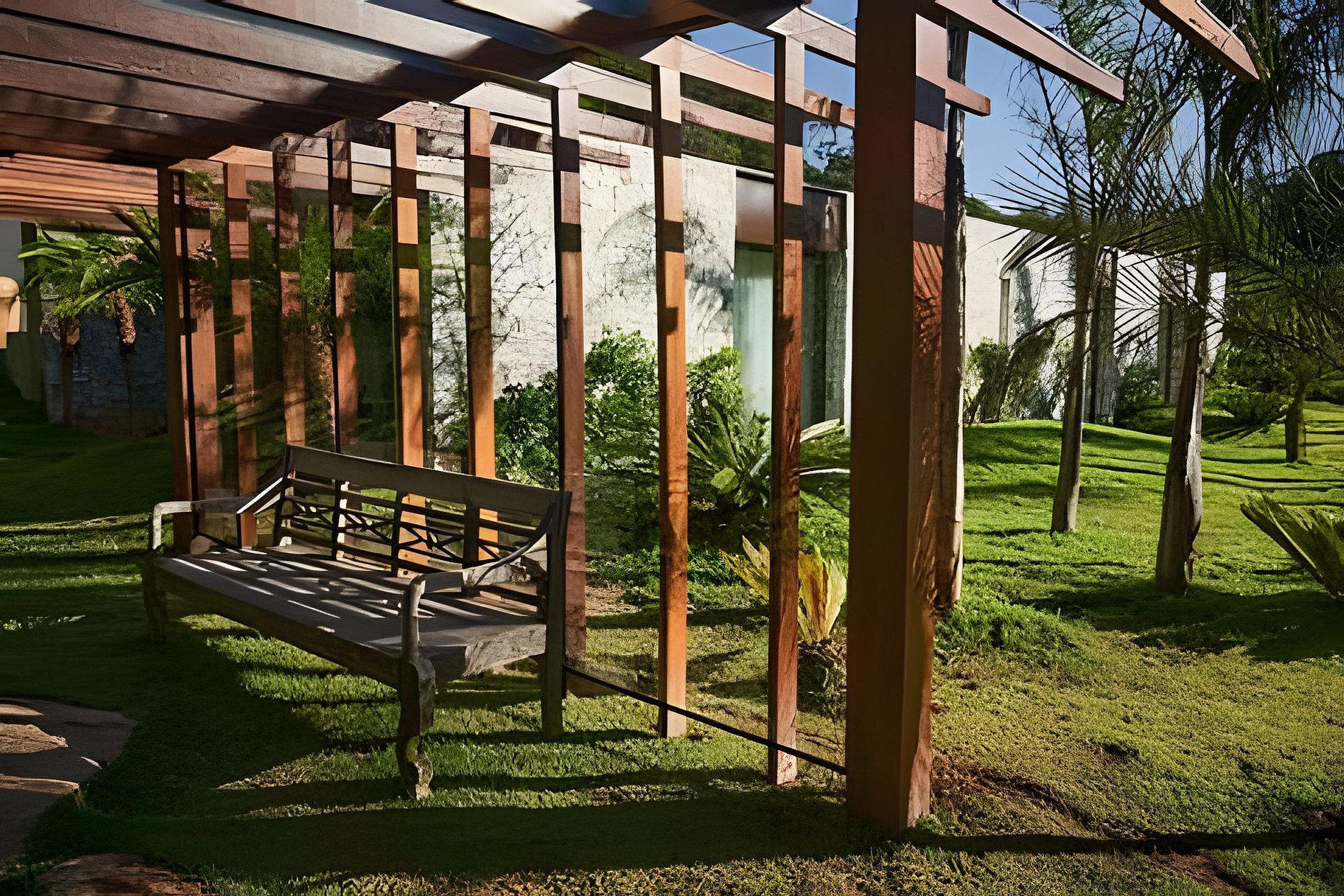 • Anexo conectado por pérgola em madeira e pedra