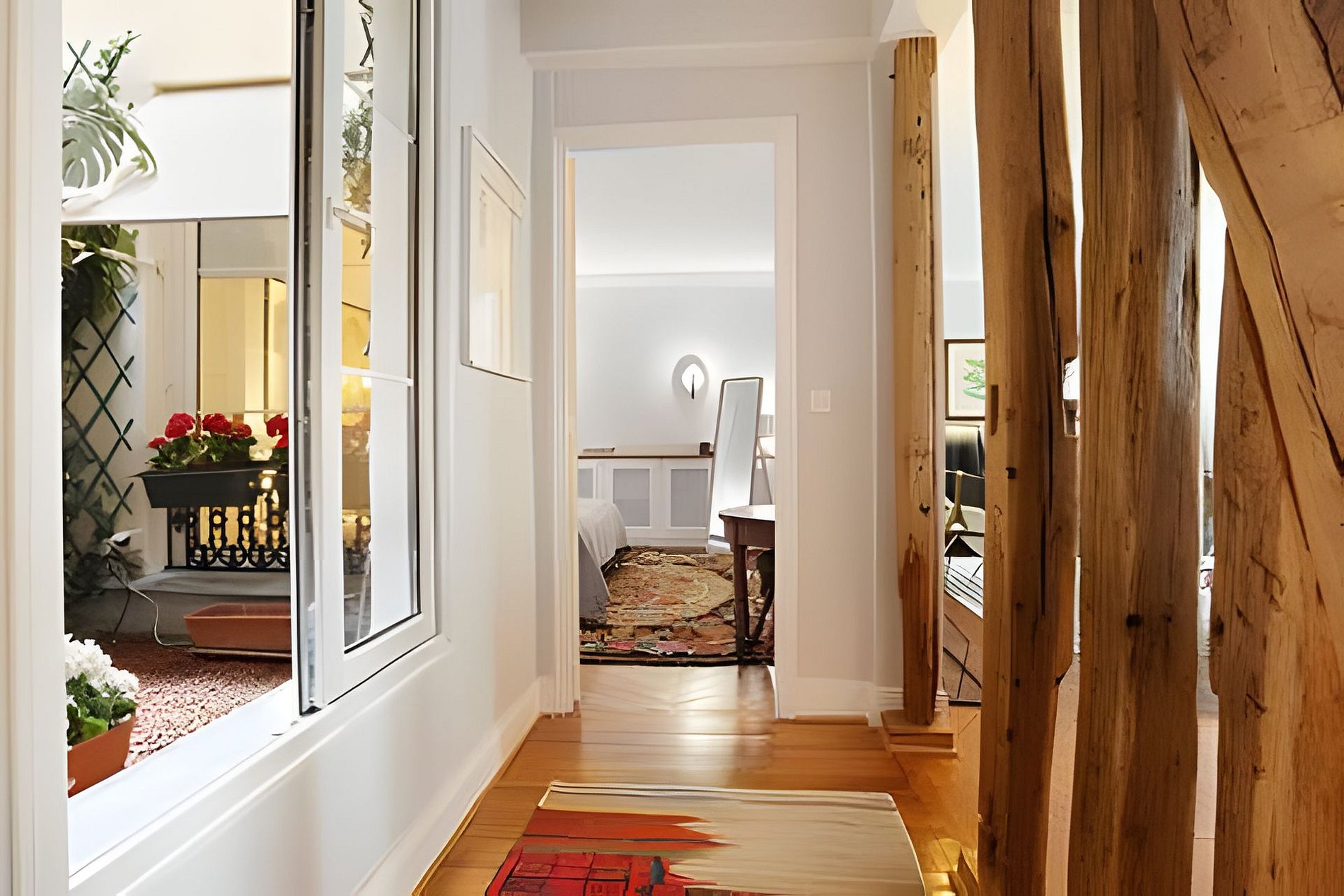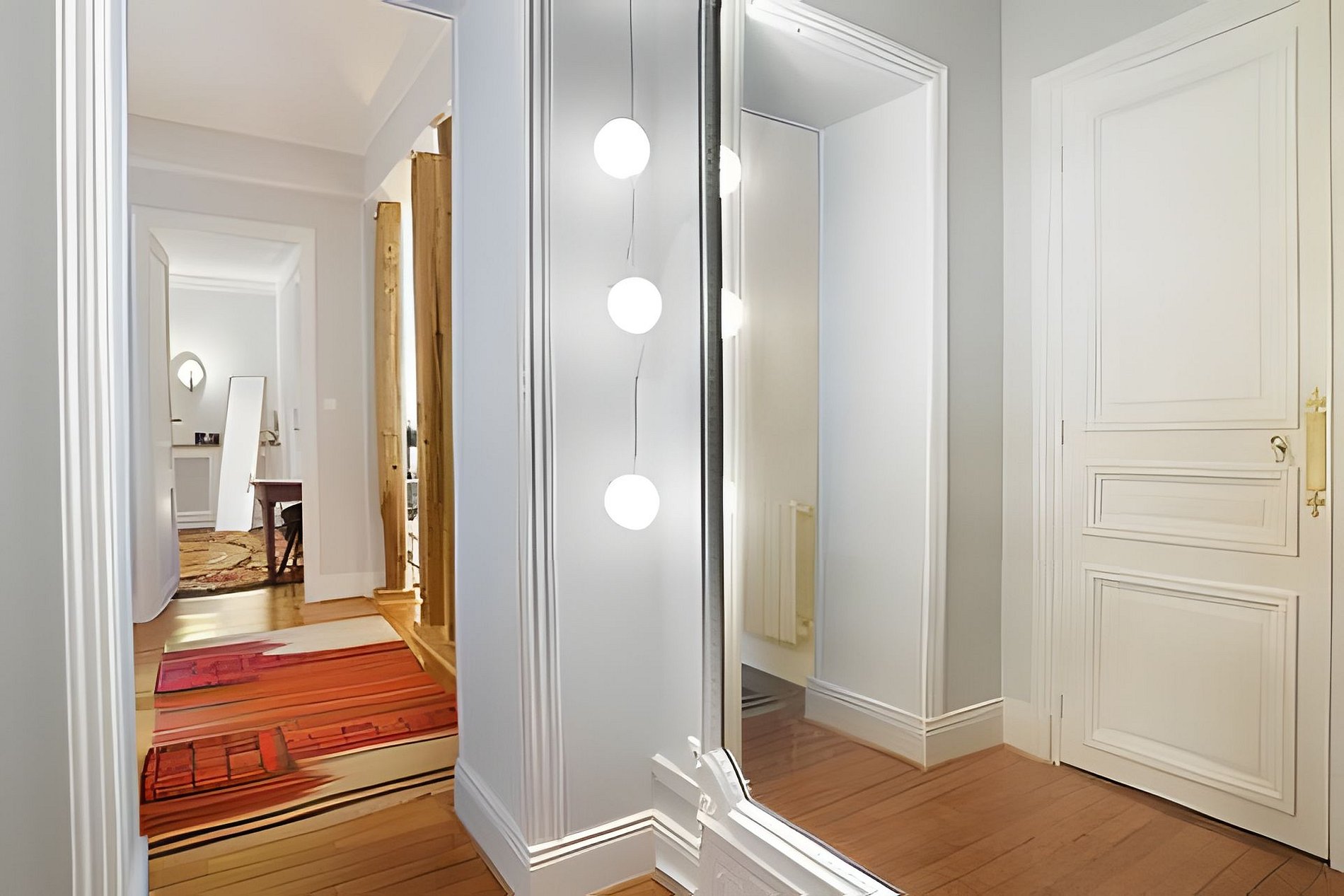This 2-bedroom apartment is located in Place du Marché Saint-Honoré, in the 1st arrondissement of Paris, right in the city center, on the 1st floor (with an elevator) of a charming old building. Upon entering, you will find a hallway that leads to: